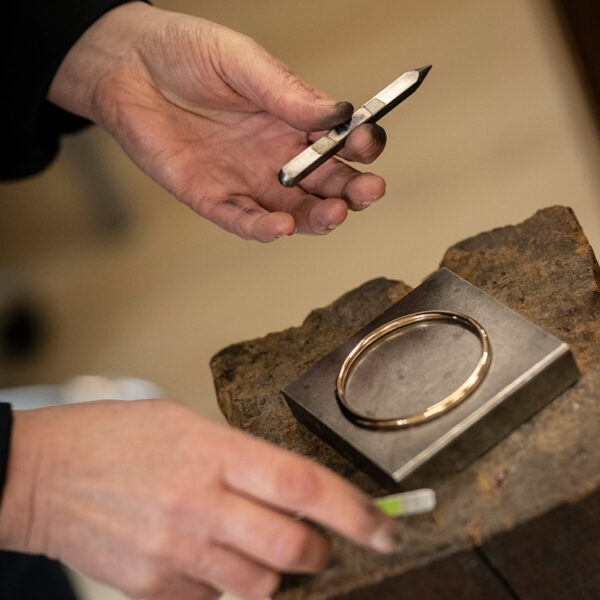 En fonction du type de bijou, le poinçon n’est pas toujours placé au même endroit. Sur une bague fabriquée au sein de notre atelier, les poinçons se trouvent à l’extérieur de l’anneau, car nous les apposons à la main en fin de fabrication. Cela permet d’éviter toute déformation ou marque prématurée durant les étapes de façonnage et de finition.