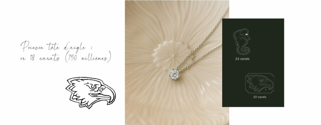 Les bijoux façonnés au sein de notre atelier portent ainsi deux poinçons : le premier est notre poinçon personnel, et le second est une tête d’aigle si votre bijou est en or, ou une tête de chien s’il est en platine.